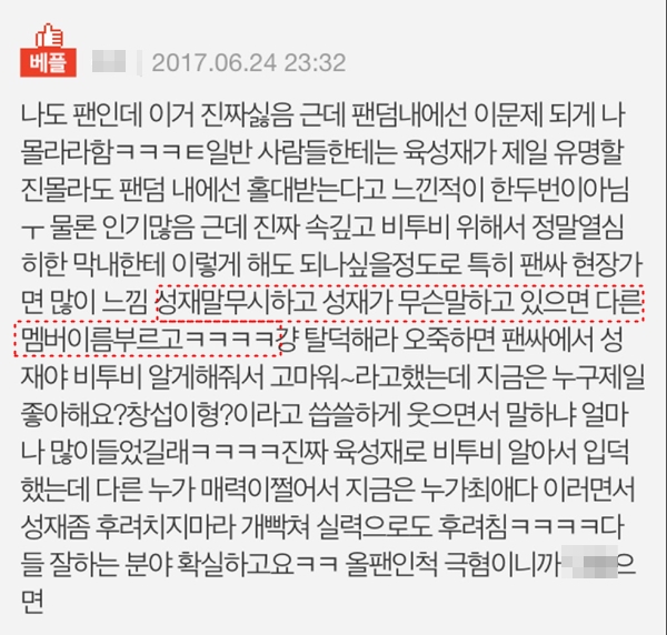 '비투비' 육성재가 일부 팬들에게 차별 대우를 받고 있습니다. 이를 목격한 팬들의 항의글이 쏟아지고 있는데요.