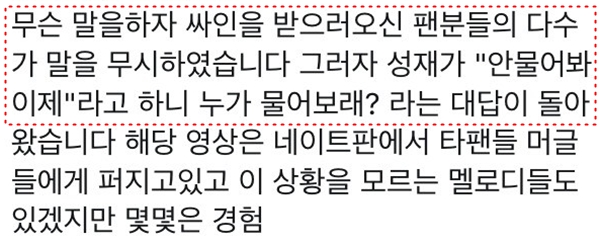 또 다른 팬도 차별 대우에 대해 꼬집었습니다. "성재가 무슨 말을 하자 다수의 팬들이 무시했다"고 말했습니다.