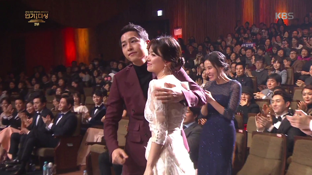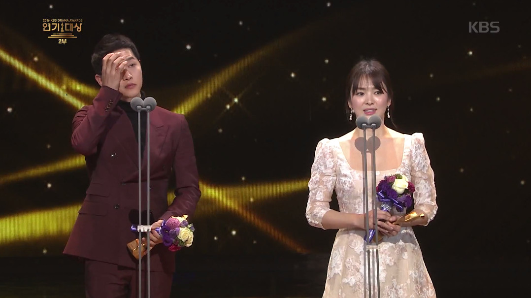 KBS 측은 2016년 연기 대상으로 KBS-2TV '태양의 후예'에 출연한 송혜교와 송중기의 이름을 호명했습니다. 두 사람은 서로의 손을 꼭 맞잡았고요. 가벼운 포옹으로 기쁨을 표했죠.