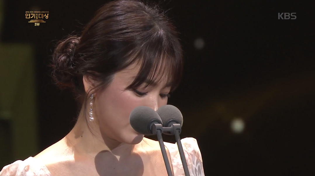 마지막으로 송중기에게 애정을 표했습니다. 송혜교는 "이 상을 받을 수 있던 건 최고의 파트너 송중기씨를 만나서 그렇다. 중기씨가 아니었음 여기 설 수 없었을 것"이라 말했습니다.