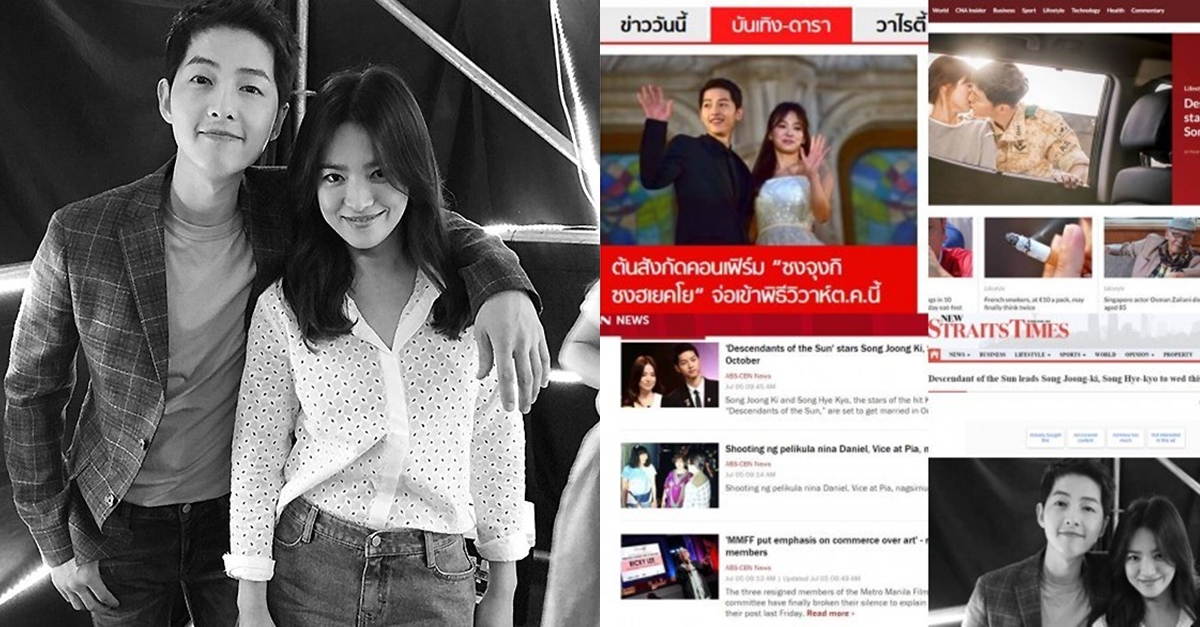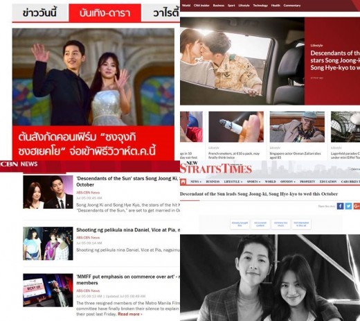 한류 콘텐츠에 관심이 큰 동남아 국가 주요 매체들도 송혜교 송중기의 소식을 비중 있게 다루고 있다. 태국 Sanook, 싱가포르 채널뉴스아시아, 필리핀 ABS-CBN 뉴스, 말레이시아 뉴스트레이트타임즈 등 유력 매체들도 한국의 스타 커플인 송중기 송혜교의 결혼 소식을 일제히 보도하고 있다. 아시아의 '브란젤리나'라고 해도 무방할 정도의 반응이다.