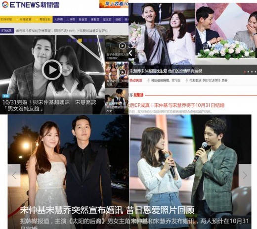홍콩과 대만도 마찬가지다. 애플데일리, ET투데이, 자유시보 등 현지 매체는 송혜교 송중기 결혼을 집중 보도했다. '태양의 후예' 인연부터 두 사람의 열애설과 결혼설을 되짚어보는 기사도 쏟아지고 있다.
