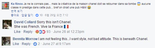 그 뿐 아닙니다. "H&M 광고처럼 보인다", "코코 샤넬이 본다면 싫어할 것이 분명하다" 등 비아냥대는 댓글도 있었습니다.