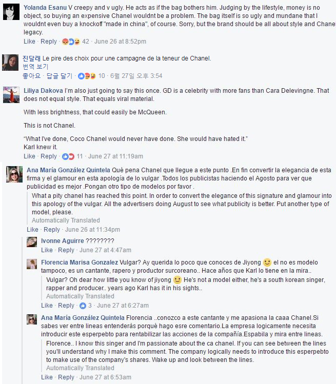 이들은 "아시아인 때문에 샤넬의 이미지가 사라졌다", "가방이 추해 보인다", "나는 더이상 샤넬을 구매하고 싶지 않다", "최악의 광고, 수준 이하" 등 댓글을 달았습니다.
