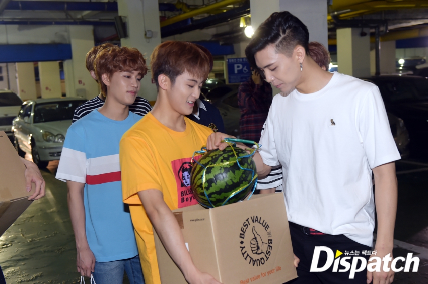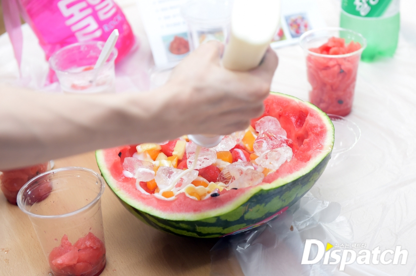 태용과 마크는 조금 더 특별한 화채를 완성했습니다. 수박 안에 후르츠, 연유, 얼음을 넣었는데요.