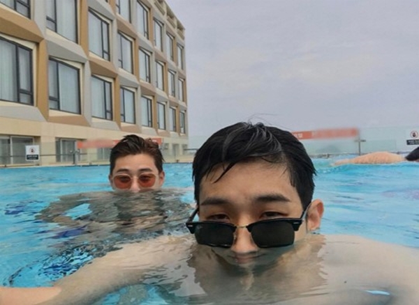 두 사람은 수영장에서 물놀이를 했습니다. 잠수를 즐기며 셀카를 찍었는데요. 선글라스로 가려도 훈훈한 비주얼은 숨길 수 없었습니다.