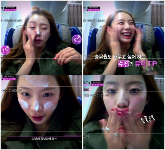 ▶ 자기관리 파: 박수진은 피부 관리에 집중합니다. "기내에서는 메이크업을 지우고, 수면팩을 꼭 한다"고 촉촉한 피부의 비결을 밝혔습니다.
