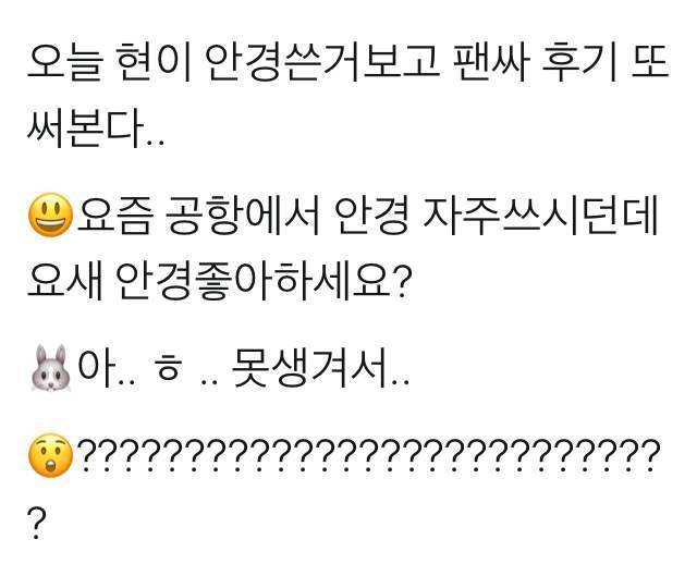 팬은 "공항에서 안경 자주 쓰던데, 안경 좋아하냐"고 물었고요. 아이린은 "못생겨서 그렇다"고 답했습니다.