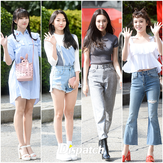 걸그룹 멤버들은 이날 다양한 여름 스타일링을 보였다. '여자친구' 예린과 '구구단' 미나는 원피스와 핫팬츠로 각선미를 뽐냈다. 선미와 리지는 청바지로 심플한 룩을 완성했다.