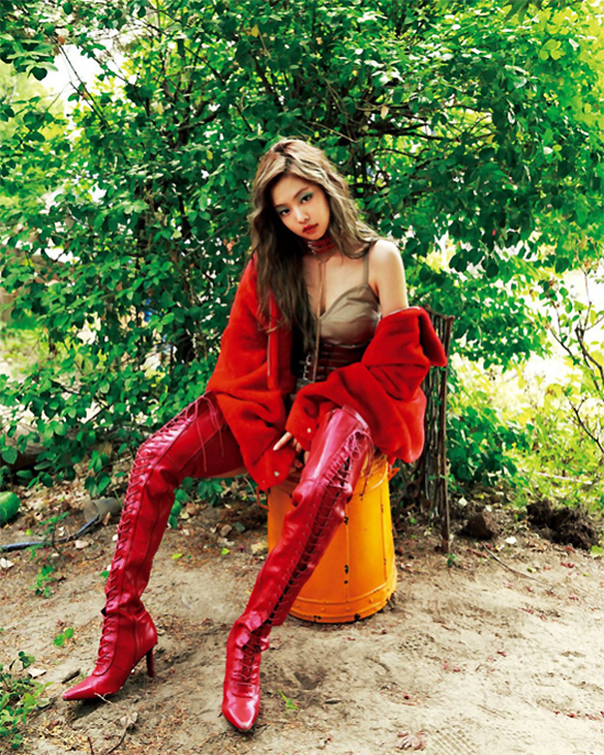 제니는 최근 패션지 '나일론 재팬' 커버 촬영을 진행했다. 수풀 사이에 앉아 도발적인 포즈를 취했다.