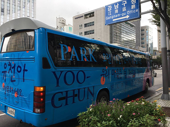 24일 SNS에는 박유천의 전역을 축하하는 랩핑버스 사진이 다수 업로드됐는데요. 이 버스는 그가 복무중인 강남구청 전역을 도는 것으로 알려졌습니다.