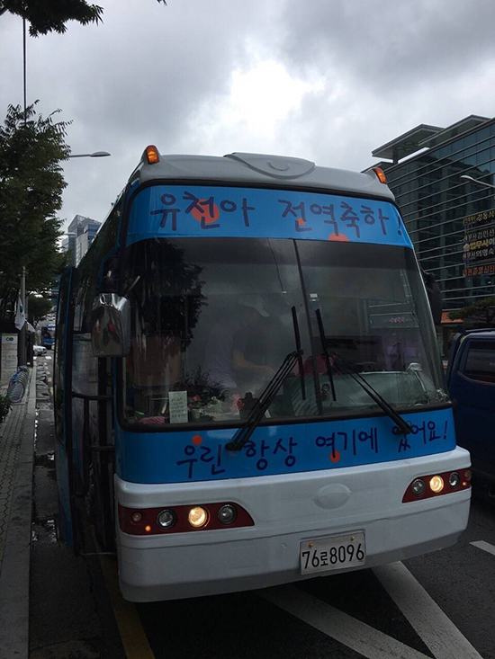 파란색 버스에는 “유천아 전역 축하”, “우린 항상 여기에 있어요”, “유천아 행복하세요” 등의 문구가 적혀있습니다.