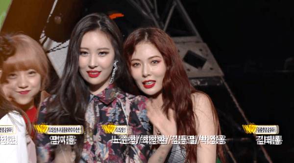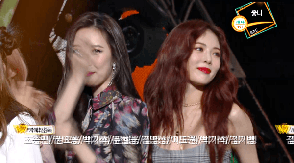 선미와 현아는 1위 후보 발표를 위해 무대로 모였습니다. 이날의 1위는 윤종신의 '좋니'였고요. 두 사람은 노래를 따라불렀습니다.
