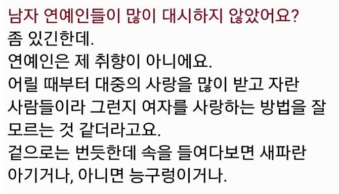 그 이유는요? 경리는 "어릴 때부터 대중의 사랑을 많이 받고 자란 사람들이라 그런지 여자를 사랑하는 방법을 잘 모르는 것 같다"고 설명했는데요.