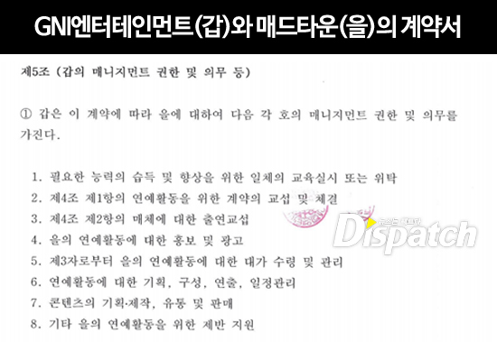 '디스패치'는 GNI엔터와 매드타운의 전속계약서를 입수했다. '갑'(GNI엔터)은 '을'(매드타운)에게 <연예활동에 대한 기획 및 일정 관리>, <연예활동을 위한 제반 지원>등의 의무를 지닌다.