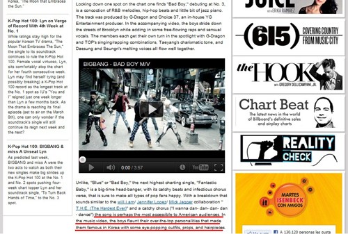 우선 새 앨범에 대한 국내 반응부터 전했다. 빌보드닷컴은 "'얼라이브'에 수록된 6곡 중 과반수 이상이 '빌보드 K팝 핫 100차트' 10위권 내에 진입했다"며 "1위를 차지한 '블루'를 포함해 '판타스틱 베이비(Fantastic baby)'가 2위, '배드 보이(Bad boy)가 5위, '사랑먼지(Love dust)'가 8위에 올랐다"고 자세히 소개했다.