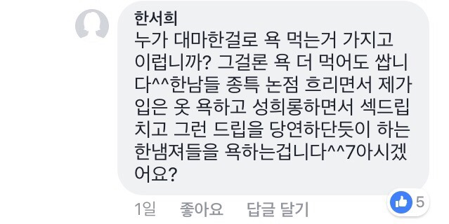 "누가 대마한 걸로 욕 먹는다고 이럽니까? 그걸로는 욕 더 먹어도 쌉니다. 한남들 논점 흐리면서 제가 입은 옷 욕하고 성희롱하고… 그런 남자들을 욕하는겁니다."