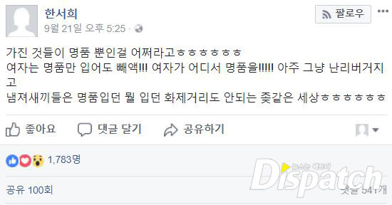 그리고 자신의 SNS에 글을 올렸습니다. "여자는 명품만 입어도 난리, 남자는 뭘 입던 화제가 안되는 세상"이라며 비꼬았습니다.