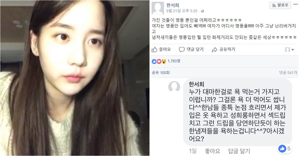 "페미니스트라는 이유로 유명해지길 원하는 게 아니다. 지금 제가 화제인 걸 이용해 페미니스트라는 사실을 알리고자 한다" (한서희)