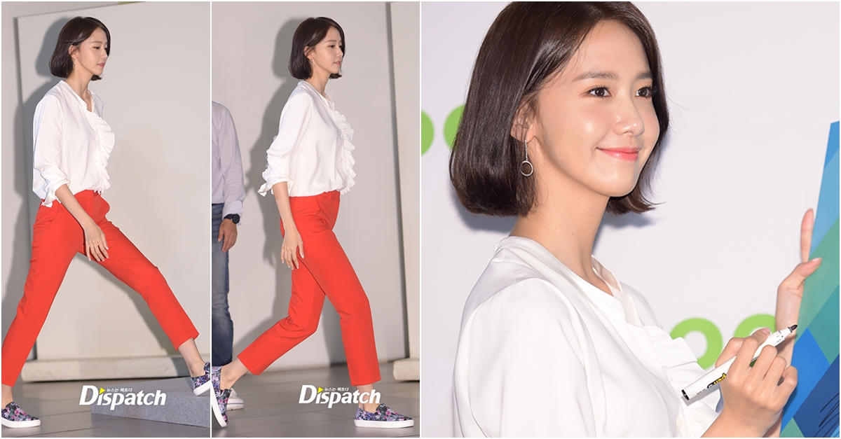 윤아는 화이트 블라우스와 레드 팬츠로 센스 있는 패션을 완성했다.