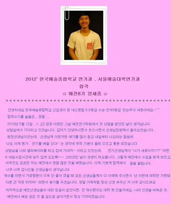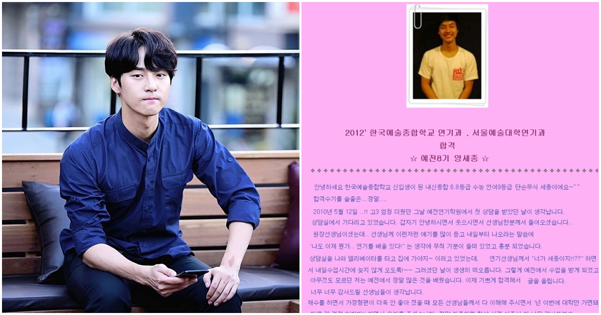 자신이 다닌 연기학원에 감사인사를 전하기도 했는데요. 양세종은 "한국예술종합학교 신입생이 된 내신, 종합 8.8등급, 수능 언어 9등급의 단순무식 양세종입니다"라며 운을 뗐습니다.