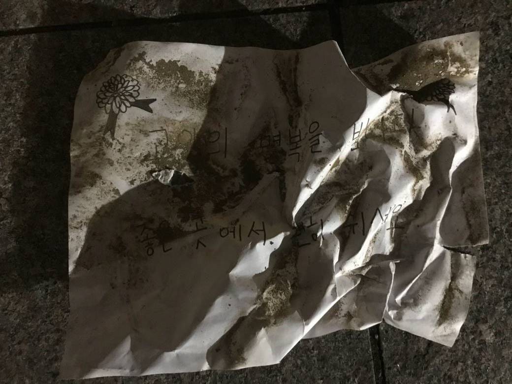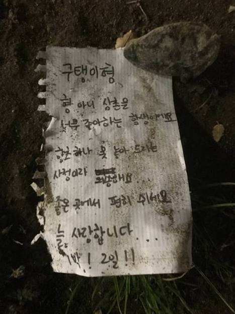 "구탱이형. 형 아니 삼촌을 너무 좋아하는 학생이에요. 향초 하나 못 놓아드리는 사정이라 죄송해요... 좋은 곳에서 편히 쉬세요. 늘 사랑합니다... 1박! 2일!!"