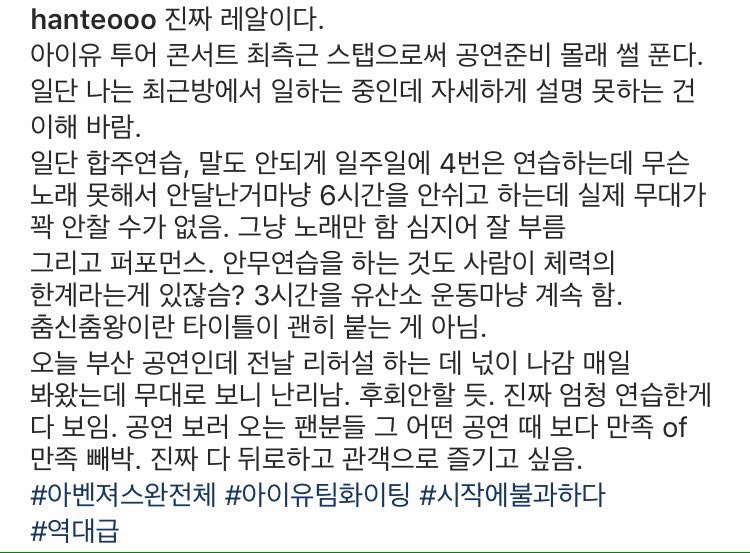 이 글을 쓴 주인공은 누구일까요? 바로 아이유와 오랫동안 일했던 아이유의 매니저였습니다. 아이유의 연습벌레 기질을 모두에게 알려주고 싶은 매니저의 마음이 이해가 되네요.