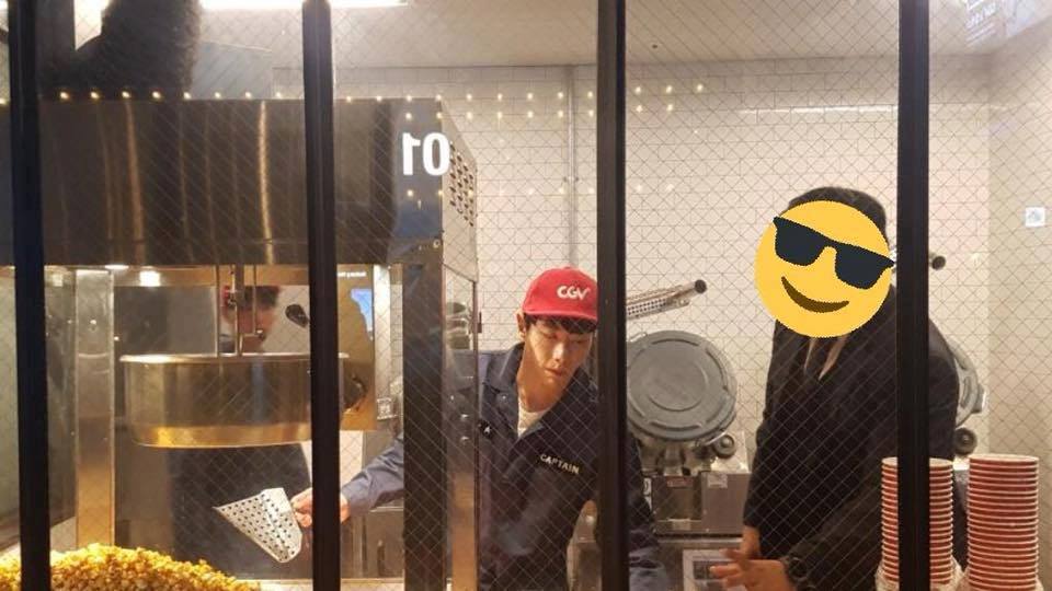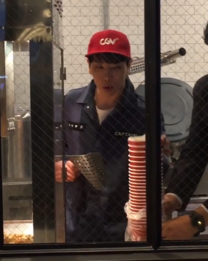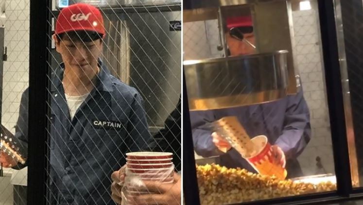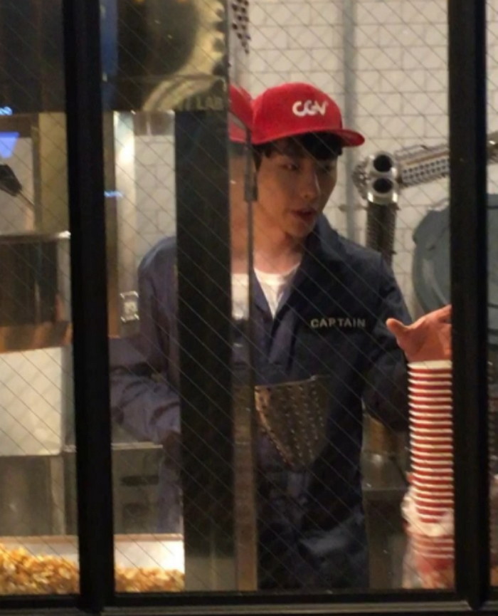 그는 지난 11일 CGV 서울 용산 아이파크몰에 등장했습니다. 그는 영화관 아르바이트생들이 입는 유니폼에 모자까지 완벽하게 착용한 모습이었죠.