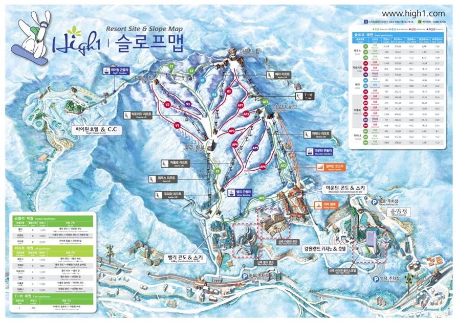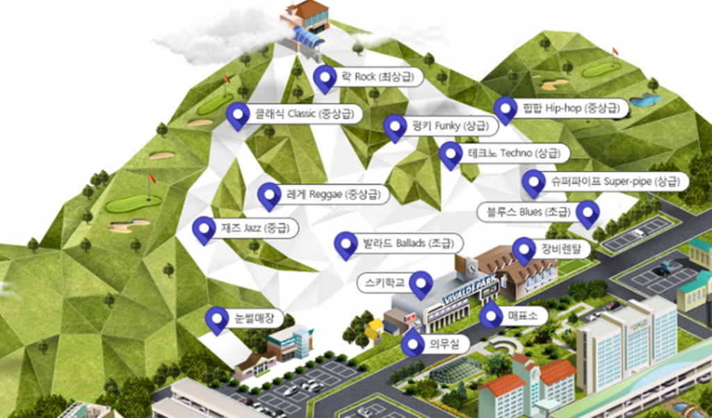 10면의 슬로프는 선키드 및 다양한 경사가 마련되어 있어 초보자부터 상급자까지 최고의 만족을 느낄 수 있다고 합니다.